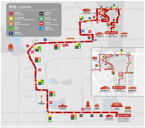 具体比赛路线是:由天安门广场起点出发,经天安门广场东侧路、东(西)长安街、复兴门外大街、复兴路、新兴桥、西三环中路辅路、花园桥、玲珑路、蓝靛厂南路、蓝靛厂北路、北四环西路辅路、北四环中路辅路、志新桥、志新东路、志新路、学院路、学清路、石板房南路、科荟路、林萃路、北五环辅路、奥林西路、速滑馆北路、速滑馆内部路、速滑馆南路、奥林西路、科荟路、奥林西路、北五环辅路、奥林东路、科荟南路、北中轴景观大道、大屯北路、湖景东路、大屯路、北中轴景观大道至比赛终点。全程42.195公里,比赛时间约6小时。